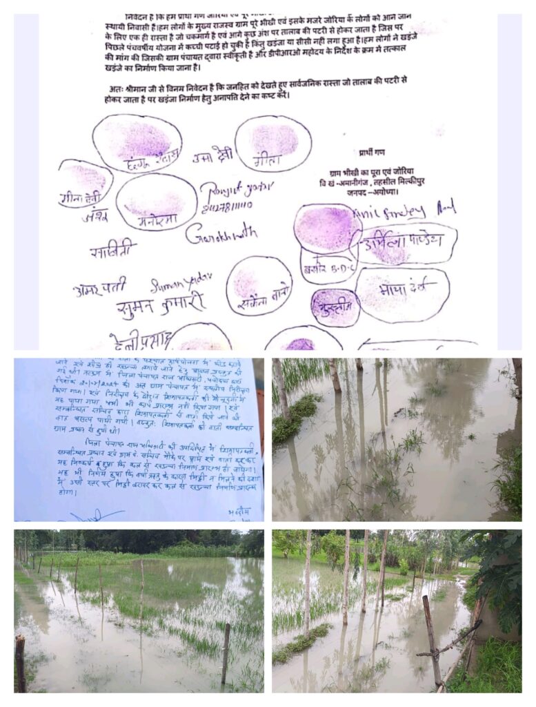 अयोध्या।वि खं अमानीगंज के जोरिया पूरे भीखी में थोड़ी सी बारिश में भी चकमार्ग एवं मुख्य खड़ंजे पर पानी भर गया, ग्राम प्रधान से कई बार मांग करने के बाद ग्रामीणों ने जन सुनवाई पर भी किया था शिकायत । शिकायत के पश्चात डी पी आर ओ अयोध्या स्वयं जांच करने पहुंचे एवं तत्काल खड़जा लगाने का निर्देश दिया किन्तु प्रधान द्वारा यह कहकर समय मांगा कि चकमार्ग ऊंचा नीचा है जिस पर मिट्टी पटाई करने के बाद खड़ंजा निर्माण करा दिया जाएगा। चकमार्ग पर पटाई का कार्य लगभग चार माह पूर्व करा दिया गया है किंतु खड़ंजा निर्माण अभी तक नहीं हो पाया।इस 300 मीटर खड़ंजा जो रामेंद्र भूषण पान्डेय के घर से सुनील पांडेय के घर के सामने से होते हुए हरिहर पान्डेय के घर के सामने से आ रहे मुख्य खड़ंजे पर मिलता है के निर्माण के साथ अमानीगंज खंडासा मुख्य मार्ग से आ रहे खड़ंजे की मरम्मत की भी मांग की गयी है। फिलहाल खड़ंजे का निर्माण ना होने से भीखी का पूरा मुख्य गांव से जोरिया होकर मुख्य मार्ग पर दो से तीन फिट पानी आ गया है।इस सन्दर्भ में वर्तमान विधायक को भी पत्र देकर मांग की गयी है,अब देखना है कि खड़ंजा निर्माण होता है या सिर्फ कागजों तक ही सीमित रहता है।