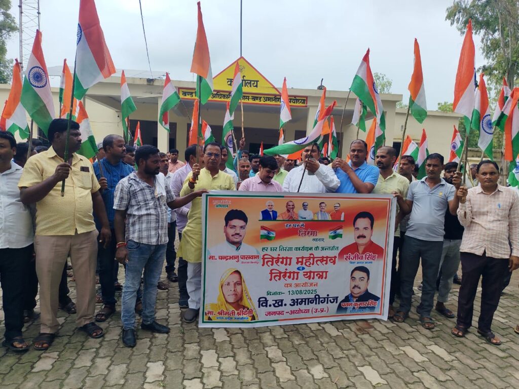 स्वतंत्रता दिवस के मद्देनजर प्रधानमंत्री नरेंद्र मोदी व मुख्यमंत्री योगी आदित्यनाथ के आह्वान पर ‘हर घर तिरंगा’ अभियान को सफल बनाने के लिए आज अयोध्या जिले के अमानीगंज ब्लॉक मुख्यालय पर एक भव्य तिरंगा यात्रा निकाली गई। जिसमें संयोजक खण्ड विकास अधिकारी सूर्य प्रकाश मिश्र, आयोजक ब्लॉक प्रमुख प्रतिनिधि पवन सिंह के नेतृत्व में निकली इस यात्रा में ब्लॉक के समस्त विभागों के कर्मचारियों ने हर्षोल्लास के साथ भाग लिया और देशभक्ति का जज्बा प्रदर्शित किया।