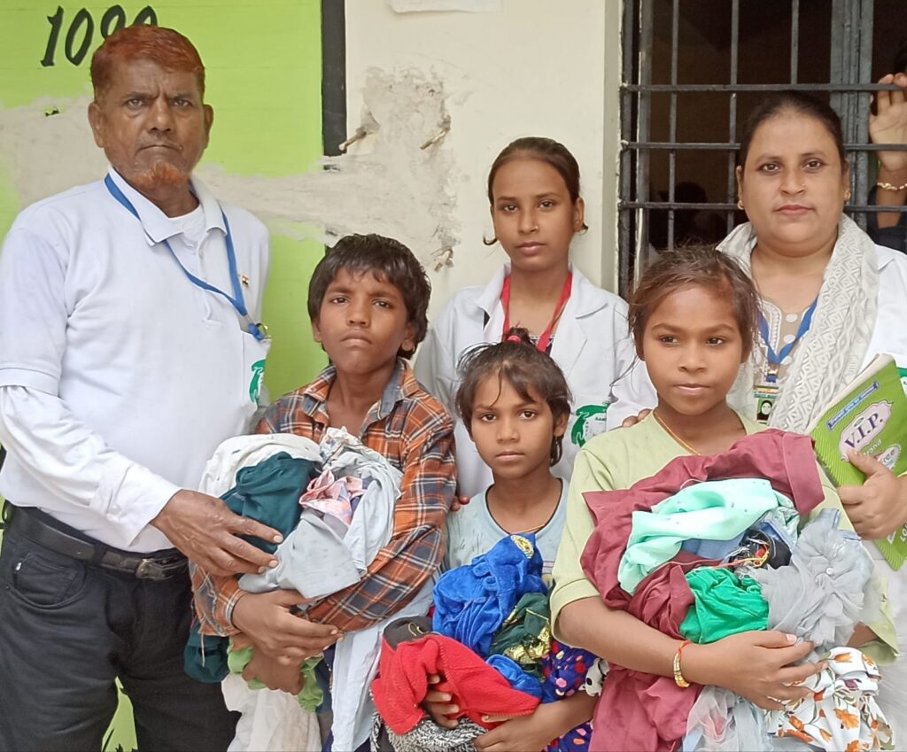 कपड़ा ,किताबें,जूते चप्पल,घड़ी आदि का वितरण।