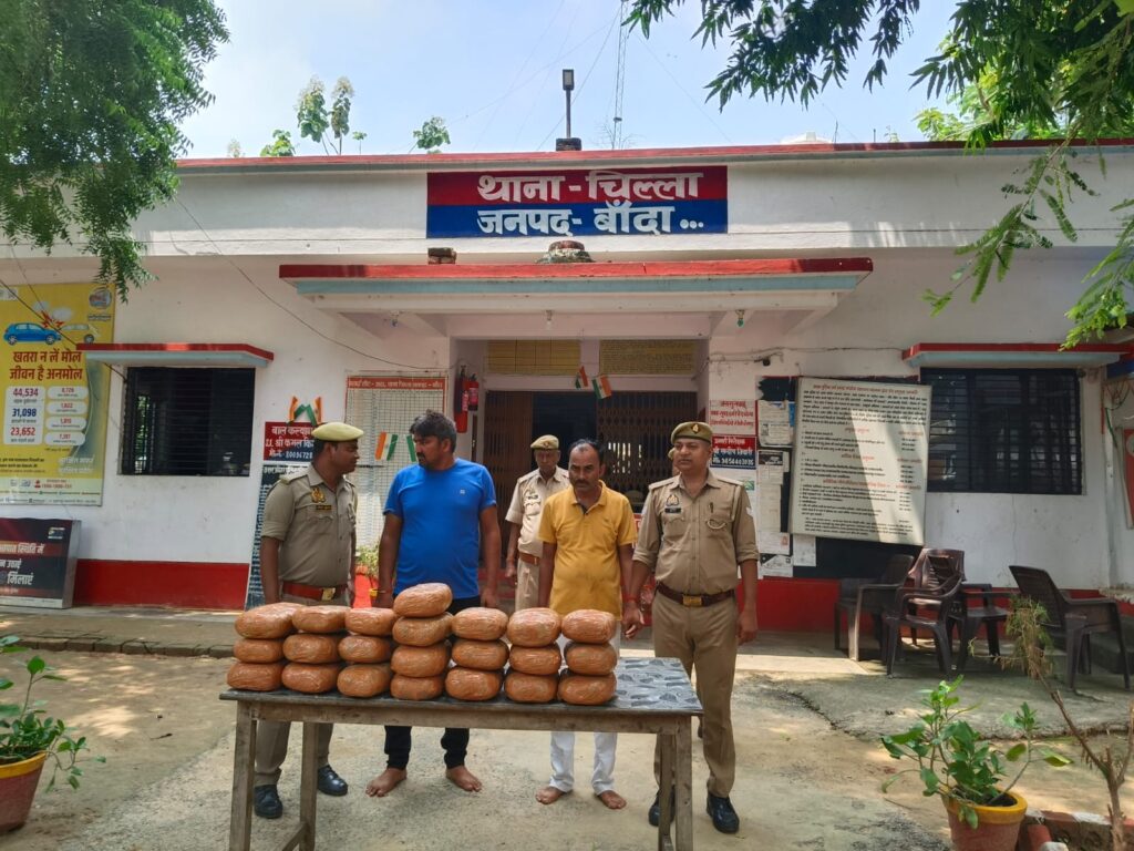 विवरण- पुलिस अधीक्षक बांदा श्री पलाश बंसल के कुशल निर्देशन में जनपद में अपराध एवं अपराधियों पर नियंत्रण लगाये जाने तथा अवैध मादक पदार्थों की तस्करी करने वाले अभियुक्तों के विरुद्ध कड़ी कार्यवाही क्रम मे अपर पुलिस अधीक्षक बांदा श्री शिवराज के निकट पर्यवेक्षण व क्षेत्राधिकारी सदर श्री राजवीर सिंह गौर के नेतृत्व में आज दिनांक 27.08.2025 को थाना चिल्ला पुलिस टीम द्वारा मुखबिर की सूचना पर तिन्दवारी मोड़ पपरेन्दा तिराहे से दो अभियुक्तों को लगभग 04 लाख रुपये कीमत के अवैध सूखा गांजा के साथ गिरफ्तार कर लिया गया है । अभियुक्त मध्य प्रदेश के रास्ते से अवैध सूखे गांजे की खेप लाते थे तथा बांदा और आसपास के जनपदों में इसकी बिक्री करते थे । अभियुक्तों के कब्जे से 22 किग्रा अवैध सूखा गांजा बरामद हुआ है । जिसके सम्बन्ध में थाना चिल्ला पर अभियोग पंजीकृत कर अभियुक्तों को मा0 न्यालय भेजा गया ।