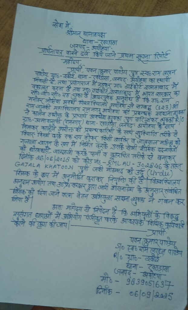 डाक्टर राम मनोहर लोहिया अवध विश्व विद्यालय से सम्बद्ध श्री राम जानकी महाविद्यालय राम नगर अमावा सूफी के प्राचार्य अवधेश शुक्ल और उनकी प्रबंधक पत्नी साधना के विरुद्ध इलाहाबाद हाईकोर्ट के अधिवक्ता एवं भारत सरकार के पूर्व सीजीसी पवन पांडेय ने कूटरचना धोखाधड़ी और जाली प्रपत्र बना कर एक राय हो अपने महाविद्यालय में फर्जी तरीके से की नियुक्ति का लगाया गंभीर आरोप। गबन कर लिया महिला का वेतन। महिला गजाला खातून पुत्री जकी मोहम्मद के शैक्षणिक प्रमाणपत्र कूट रचित। अधिवक्ता पवन पांडेय ने थाना अध्यक्ष खण्डासा को शिकायती पत्र भेज कर की मुकदमा दर्ज करने की मांग।