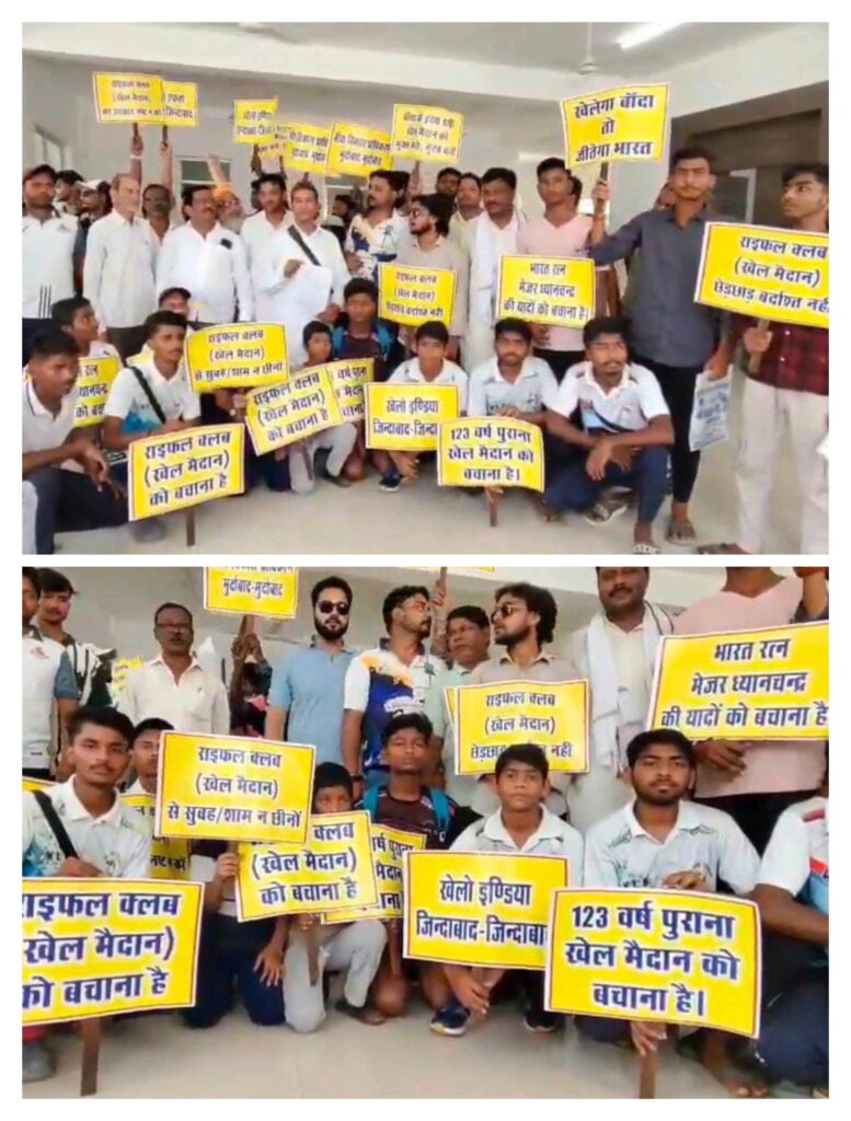 खेल के मैदान को बचाने के लिए एक साथ आये युवा और बुजुर्ग खिलाड़ी,मंडलायुक्त से मिलकर मैदान को बचाने की अपील की,123 साल पुराने खेल के मैदान राइफल क्लब को बचाने के लिए खिलाड़ियों ने संभाला मोर्चा,इसी मैदान में खेलकर कई खिलाड़ियों ने देश और प्रदेश का नाम रोशन किया है,सुबह से ही बच्चे बूढ़े इन मैदान में अभ्यास करने व सैर करने आते है,विकास प्राधिकरण द्वारा इन मैदान में व्यसायिक इमारत बनाकर बेचने का प्रस्ताव दिया है,जिसके विरोध में जनपद के सभी खिलाड़ी लामबंद हुये, मंडलायुक्त ने मैदान को बचाने का दिया आश्वाशन,खिलाड़ियों ने आज मंडलायुक्त कार्यालय में प्रदर्शन कर आयुक्त को दिया ज्ञापन।