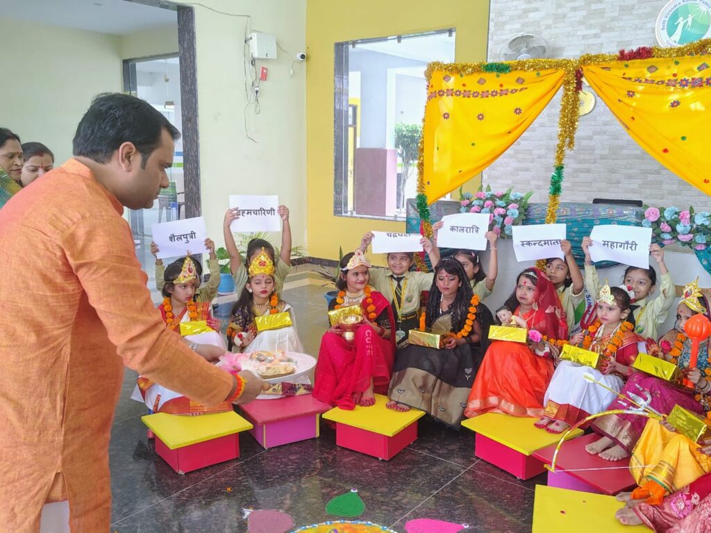 नवरात्रि के पावन अवसर पर विद्यालय में नौनिहालों को मां दुर्गा के रूप में सजाकर किया पूजा पाठ