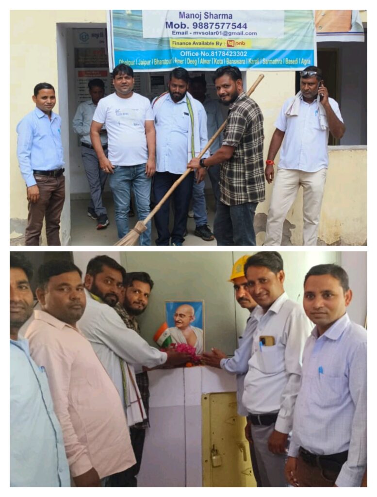 राज्य सरकार के आदेशों की पालना में सहायक अभियंता आनंद तिवारी ने उपखंड राजाखेड़ा में 33/11 केवी जीएसएस राजाखेड़ा परिसर और कार्यालय में स्वच्छता कार्यक्रम आयोजित किया गया जिस में अधिकारियों और कर्मचारियों ने ऑफिस और जीएसएस की सफाई की गैर जरूरी पत्रावलियों और सामान को चिन्हित कर अलग रखा गया और फर्श , दीवालों पर बने निशानो को पोंछ कर साफ किया गया साथ ही सभी अभियंताओं और कर्मचारियों ने सर्व प्रथम राष्ट्र पिता महात्मा गाँधी जी की तस्वीर पर माला,पुष्प अर्पित कर उनका सम्मान किया और उनकी जन्म दिवस पर उनके द्वारा किए गए देश के लिए त्याग बलिदान को याद किया गया साथ ही सभी कर्मचारियों को नशा न करने की शपथ दिलाई गई, और गांधी जी के जीवन से प्रेरणा लेने का आहवान किया गया,इस मौके पर कनिष्ठ अभियंता मयंक मिश्रा, विशाल जायसवाल, रणवीर सिंह,वरिष्ठ टेक्निशियन अवधेश शर्मा,मनोज लोधी,प्रेमकिशोर झा,रामनरेश शर्मा,ब्रजमोहन,इब्राहिम खा,अम्बरीष शर्मा इत्यादि लोग मौजूद रहे।