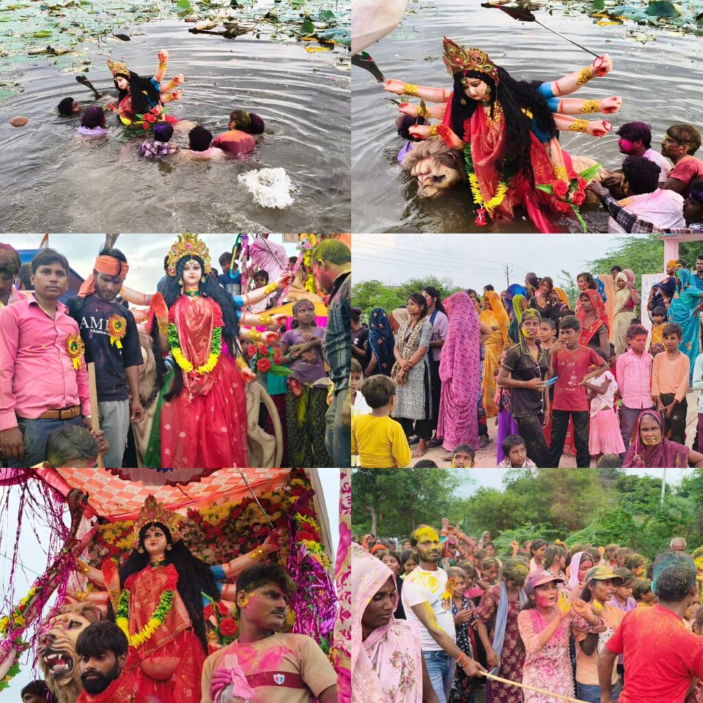 देवी प्रतिमा का विसर्जन ढोल नगाड़ों एवम डीजे की