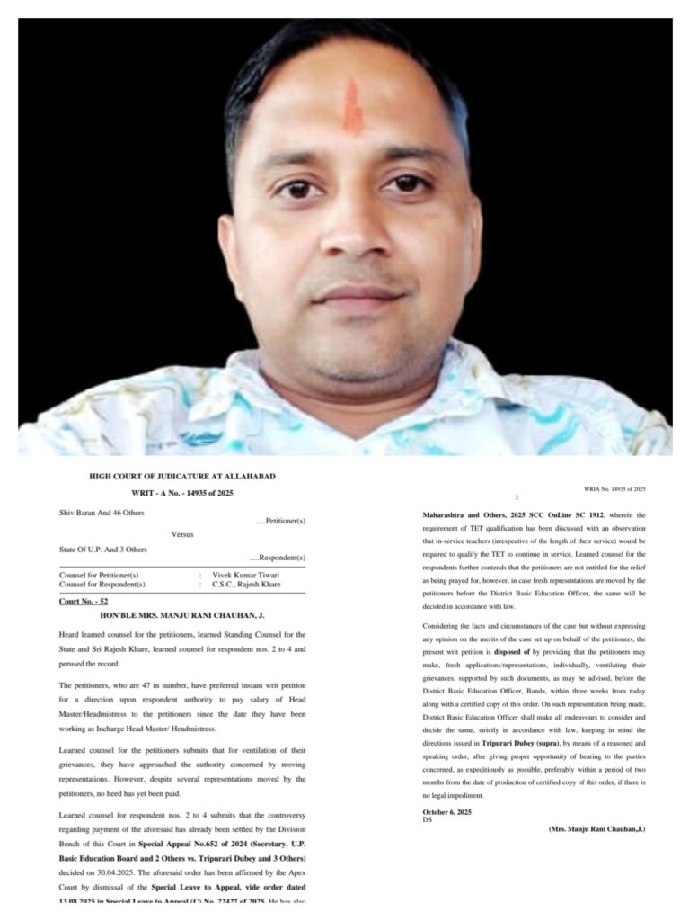 राष्ट्रीय शैक्षिक महासंघ जिला अध्यक्ष पंकज सिंह ने बताया कि शिक्षकों की भारी मांग पर राष्ट्रीय शैक्षिक महासंघ बांदा द्वारा पुनः माननीय उच्च न्यायालय में 47 इंचार्ज प्रधानाध्यापकों की याचिका दाखिल करवाई गई, जिसमें माननीय उच्च न्यायालय प्रयागराज ने सुनवाई करते हुए याचिका दाखिल करने वाले इंचार्ज प्रधानाध्यापकों को त्रिपुरारी दुबे वाली याचिका की भांति दो माह के अंदर प्रधानाध्यापक का वेतन भुगतान करने का आदेश किया है। इस याचिका की पैरवी राष्ट्रीय शैक्षिक महासंघ के जिला अध्यक्ष पंकज सिंह द्वारा की गई है।