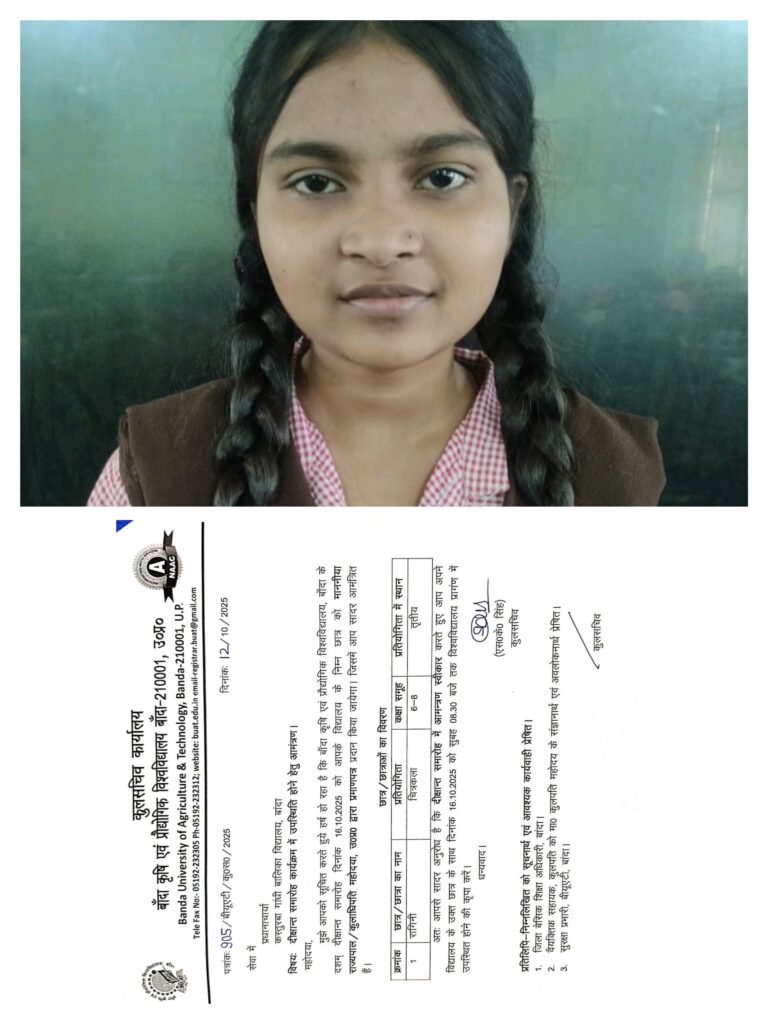 कस्तूरबा गांधी बालिका विद्यालय महोखर बड़ोखर खुर्द बांदा की छात्रा रागिनी आगामी 16 अक्टूबर 2025 को बाॅंदा कृषि एवं प्रौद्योगिकी विश्वविद्यालय में आयोजित दशम् दीक्षांत समारोह में माननीया राज्यपाल/ कुलाधिपति महोदया के करकमलों द्वारा सम्मानित की जाएगी। ज्ञातव्य हो कि रागिनी ने चित्रकला प्रतियोगिता में तृतीय स्थान प्राप्त कर उल्लेखनीय प्रदर्शन किया है जिसके लिए उन्हें सम्मानित किया जाएगा। रागिनी की इस शानदार उपलब्धि पर जिला बेसिक शिक्षा अधिकारी बाॅंदा अव्यक्त राम तिवारी, बालिका शिक्षा समन्वयक आदर्श कुमार, जिला विज्ञान मेंटर डा० इन्द्रवीर सिंह, प्रभारी वार्डन कविता, लेखाकार रामविलास, चित्रकला शिक्षिका सुमन निगम तथा खेल शिक्षक प्रदीप कुमार आदि ने बधाई एवं शुभकामनाएं दी हैं।