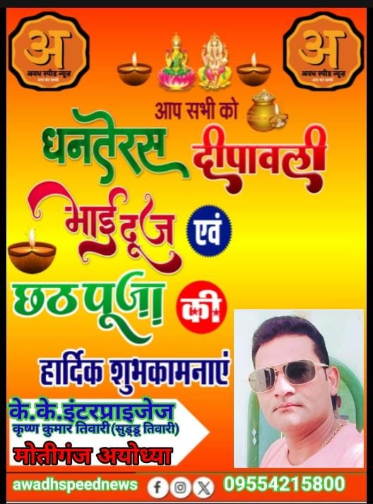 के .के. इन्टरप्राइजेज, कृष्ण कुमार तिवारी (सुड्डू तिवारी) के तरफ से सभी क्षेत्रवासियों एवं देशवासियों को धनतेरस, दिपावली, भाईया दूज पर्व की हार्दिक बधाई एवं शुभकामनाएं