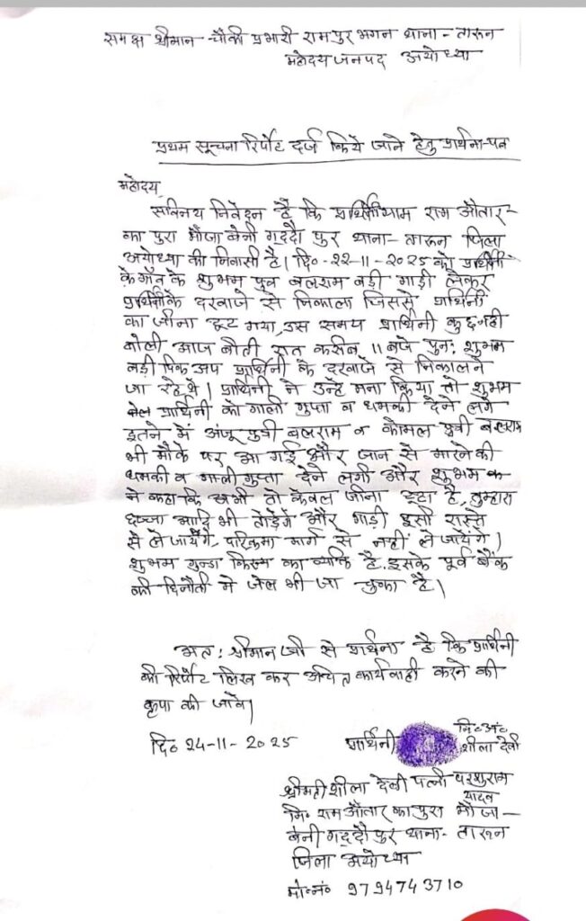 मामला जनपद के तारून थाना क्षेत्र से जुड़ा है पीड़िता शीला देवी पत्नी परशुराम निवासिनी राम ओतार का पुरा , बेनी गद्दोपुर ने हमारे ब्यूरो को बताया कि घटना दिनाक 22–11-2025 को पीड़िता के गांव के रहने वाले दबंग शुभम पुत्र बलराम पिकअप गाड़ी लेकर पीड़िता के दरवाजे से तेजी से निकाला जिससे टक्कर लगने से पीड़िता का जीना टूट गया, उस समय पीड़िता कुछ नही बोली लेकिन रात करीब 11 बजे पुनः शुभम पिक अप पीड़िता के दरवाजे से निकालने जा रहा था तो पीड़िता ने उन्हें मना किया तो शुभम भड़क गया और पीड़िता को गंदी गंदी गालियां और धमकी देने लगा इतने में अंजू पुत्री बलराम व कोमल पुत्री बलराम भी मौके पर आ गई और मां बहन की गंदी गंदी गालियां देते हुए अमादा फौजदारी हुई शुभम ने कहा कि अभी तो केवल जीना टूटा है, तुम्हारा छज्जा भी तोड़ेंगे और गाड़ी इसी रास्ते से ले जायेंगे, परिक्रमा मार्ग से नहीं ले जायेंगे ,शुभम क्षेत्रीय गुन्डा है, इसके पूर्व बैंक की छिनौती में जेल भी जा चुका है पीड़िता ने स्थानीय पुलिस को शिकायती पत्र देकर कार्यवाही की मांग की है |
