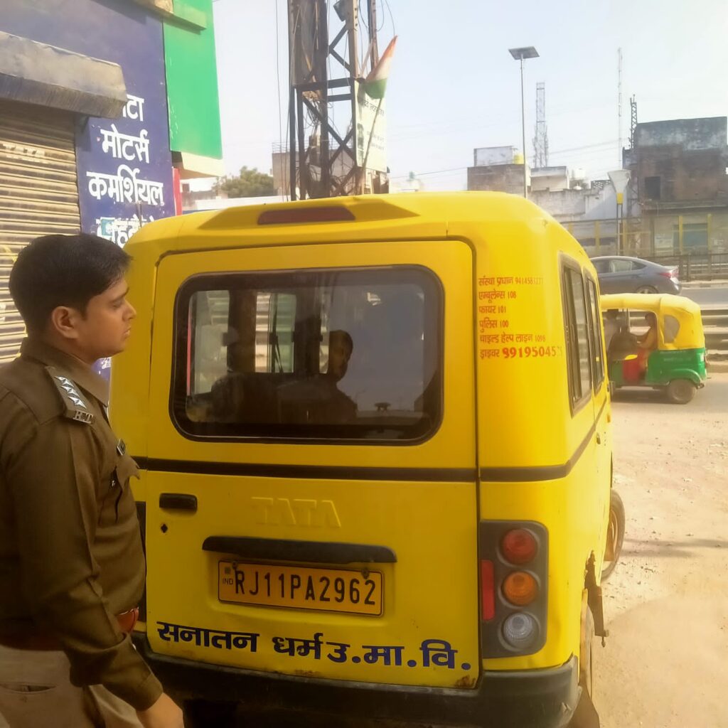 उक्त निर्देशों के अनुक्रम में जिला परिवहन अधिकारी के निर्देशन में परिवहन निरीक्षक श्रीकांत कुमावत द्वारा आज दिनांक 05.12.2025 को शहर में विभिन्न स्थानों पर बाल-वाहिनियों का चैकिंग अभियान चलाया गया। चैकिंग के दौरान कई स्कूल की बस और वैन ओवरलोडिंग, निर्धारित क्षमता से अधिक बच्चों को बैठाने, फिटनेस प्रमाण पत्र की कमी, फर्स्ट-एड बॉक्स न होने तथा सुरक्षा मानकों का पालन न करने की स्थिति में पाई गईं, मौके पर ही संबंधित चालकों के चालान बनाए और विद्यालय प्रबंधन को सख्त चेतावनी जारी करते हुए कहा कि बच्चों की सुरक्षा से किसी तरह का समझौता स्वीकार नहीं किया जाएगा। सभी वाहन नियमित रूप से मेंटेनेंस कराएं, ड्राइवरों का वेरिफिकेशन सुनिश्चित हो तथा परिचालकों को सुरक्षा मानकों का विशेष प्रशिक्षण दिया जाए। अभियान के दौरान अधिकारियों ने अभिभावकों और आमजन से भी अपील की कि वे किसी भी प्रकार की अनियमितता दिखने पर तुरंत रिपोर्ट करें, ताकि सुरक्षित छात्र परिवहन व्यवस्था सुनिश्चित की जा सके। टीम ने बताया कि ऐसे निरीक्षण समय-समय पर जारी रहेंगे और नियमों का उल्लंघन करने वालों पर कठोर कार्रवाई की जाएगी।
