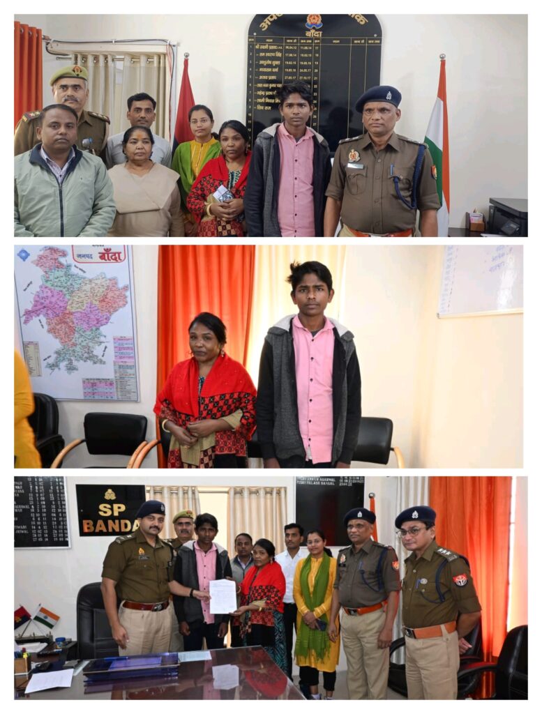 पुलिस अधीक्षक बांदा पलाश बंसल के निर्देशन व अपर पुलिस अधीक्षक शिवराज के नेतृत्व में चलाये जा रहे अभियान *“ऑपरेशन मुस्कान”* के क्रम में दिनांक 12.12.2025 को थाना विशेष किशोर इकाई (SJPU), थाना मानव तस्करी रोधी पुलिस (AHTU), चाइल्ड हेल्पलाइन यूनिसेफ व अन्य संयुक्त टीम द्वारा 10 वर्षों से गुमशुदा नाबालिक बच्चे को उसकी मां को सुपुर्द किया गया है । बालक किशन 06 वर्ष की अवस्था में बच्चा अपनी मां के साथ श्री कामदगिरी परिक्रमा पथ से 2014-15 में लापता हो गया था । मां द्वारा काफी प्रयास किये जाने के बाद भी वह न मिल सका । मटौंध से महोबा जाने वाली रेलवे लाइन के किनारे बच्चे को रेलवे लाइन से जाता देखकर ट्रैकमैन द्वारा डायल 112 को सूचना दि गई पीआरवी द्वारा पूछताछ करते हुए महोबा पुलिस चाइल्ड हेल्पलाइन सेंटर भेजा गया व बच्चे के काउन्सलिंग के दौरान बच्चे द्वारा ग्राम मऊ, थाना मर्का व बबेरु जनपद बांदा का नाम बताया गया । जिसके बाद महोबा पुलिस द्वारा बच्चे को बाल कल्याण समिति जनपद बांदा भेजा गया । पुलिस की विशेष टीमो का गठन कर बच्चे के मां की खोजने का प्रयास किए जाने लगे ।