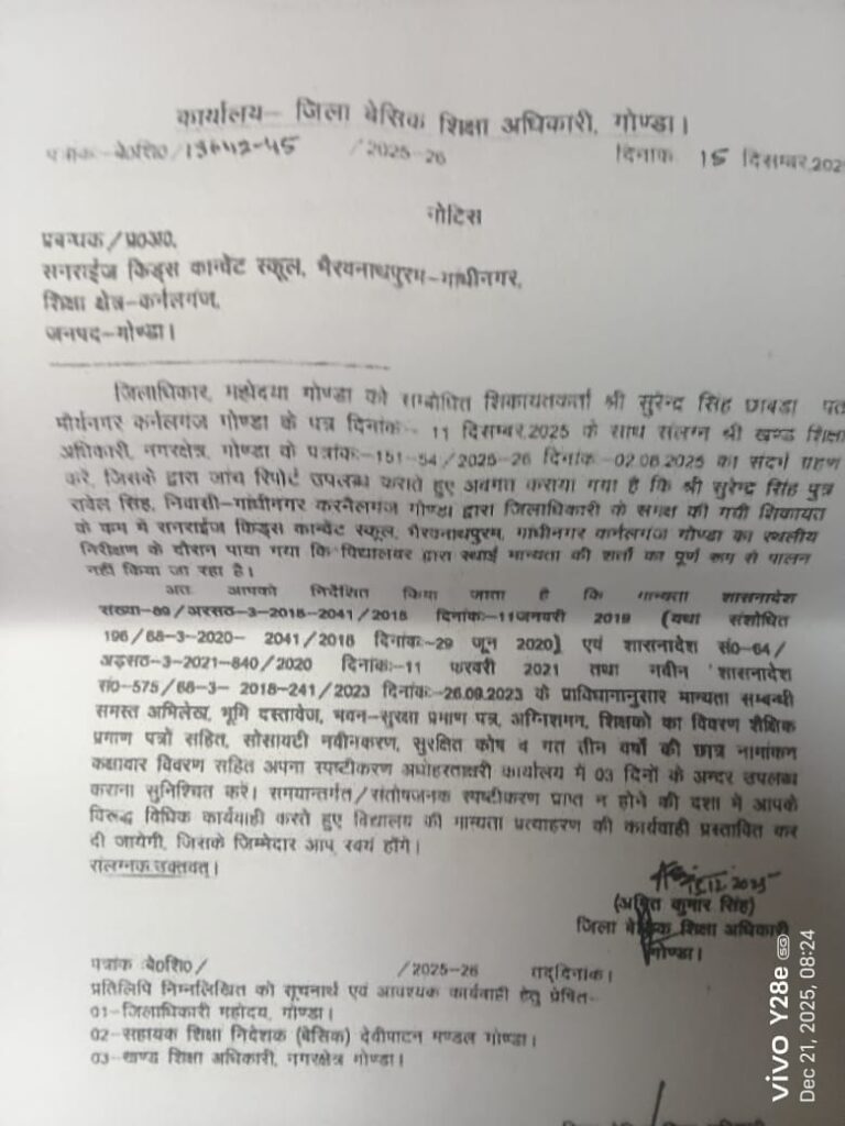 जनपद गोंडा के कर्नलगंज शिक्षा क्षेत्र अन्तर्गत भैरवनाथपुरम, गांधीनगर स्थित सनराईज किड्स कान्वेंट स्कूल पर शिक्षा विभाग ने सख्त रुख अपनाया है। जिला बेसिक शिक्षा अधिकारी (बीएसए) गोंडा ने विद्यालय प्रबंधन को कारण बताओ नोटिस जारी करते हुए तीन दिन के भीतर स्पष्टीकरण प्रस्तुत करने का निर्देश दिया है। समय पर संतोषजनक जवाब न मिलने की स्थिति में विद्यालय की मान्यता प्रत्याहरण (रद्द) की कार्रवाई किए जाने की चेतावनी दी गई है। यह कार्रवाई जिलाधिकारी गोंडा को प्रेषित एक शिकायत के आधार पर की गई है। शिकायतकर्ता सुरेन्द्र सिंह छाबड़ा, निवासी मौर्यनगर कर्नलगंज द्वारा दिनांक 11 दिसंबर 2025 को शिकायत दर्ज कराई गई थी। शिकायत के क्रम में नगर शिक्षा अधिकारी द्वारा विद्यालय का स्थलीय निरीक्षण कराया गया, जिसकी जांच रिपोर्ट बीएसए कार्यालय को उपलब्ध कराई गई।