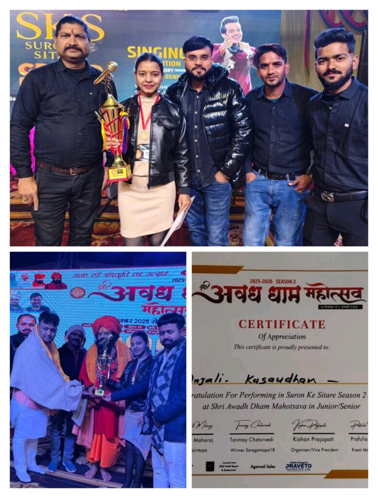 मिल्कीपुर क्षेत्र के बारुन चौराहा निवासी लक्ष्मी शरण कसौधन की पुत्री अंजली कसौधन ने अवध धाम महोत्सव में ‘सुरों के सितारे सीजन 2’ का प्रतिष्ठित खिताब जीतकर अपने क्षेत्र का नाम रोशन किया है।अयोध्या जिले के नाका हनुमानगढ़ी के निकट नीलकंठ लान में आयोजित अवध धाम महोत्सव में देर रात फाइनल मुकाबला हुआ।