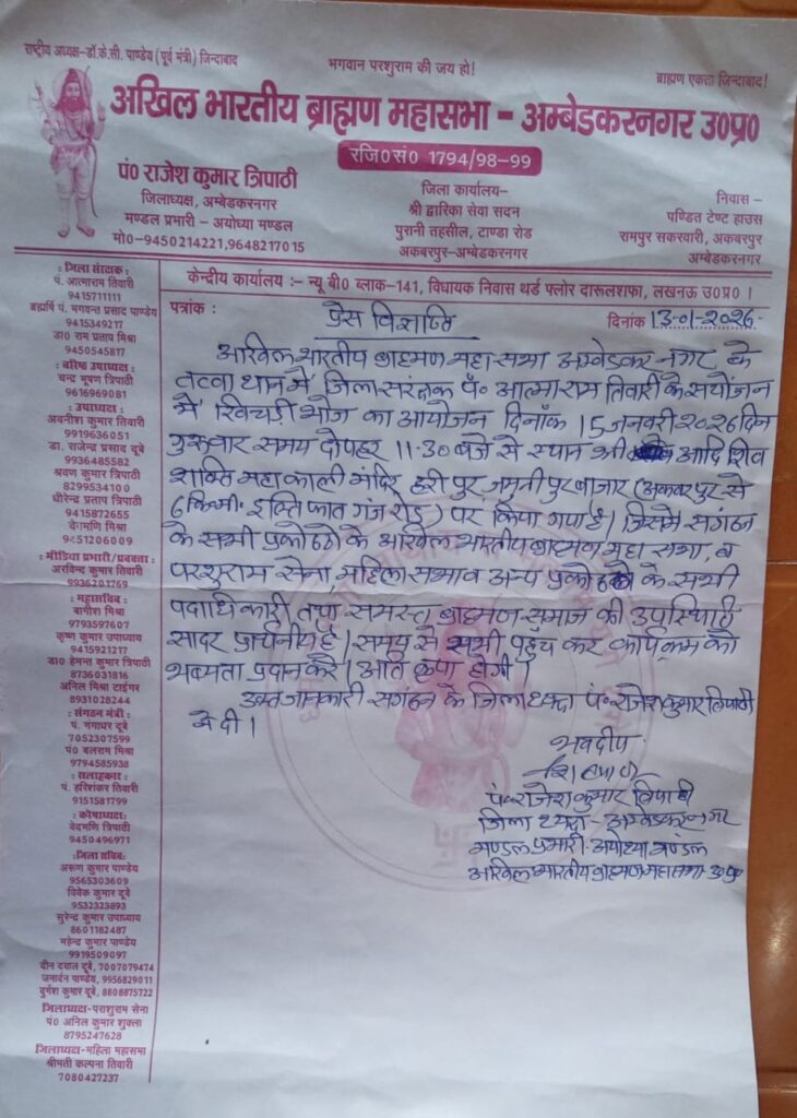 तत्वावधान में जिला संरक्षक पं0 आत्मा राम तिवारी के संयोजन में खिचड़ी भोज का आयोजन दिनांक 15 जनवरी 2026 दिन गुरुवार समय दोपहर 11-30 बजे से स्थान श्री आदि शिव शक्ति महा काली मंदिर हरी पुर, जमुनी पुर बाजार (अकबरपुर से 06 कि मी इल्तिफात गंज रोड) पर किया गया है। जिसमें संगठन के सभी सभी प्रकोष्ठो के अखिल भारतीय ब्राह्मण महा सभा, परशुराम सेना, महिला सभा व अन्य प्रकोष्ठो के सभी पदाधिकारी तथा समस्त ब्राह्मण समाज के लोगों की उपस्थिति सादर प्रार्थनीय है। समय से सभी पहुँच कर कार्यक्रम को भब्यता प्रदान करें। अति कृपा होगी।