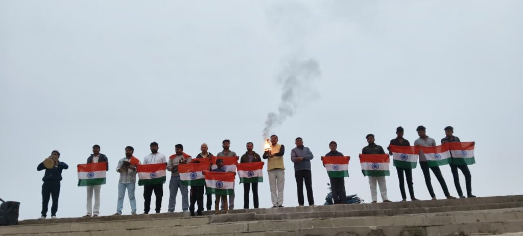 भक्तों ने की केन जल महाआरती, हाथों में तिरंगा थामकर लगाए जयकारे