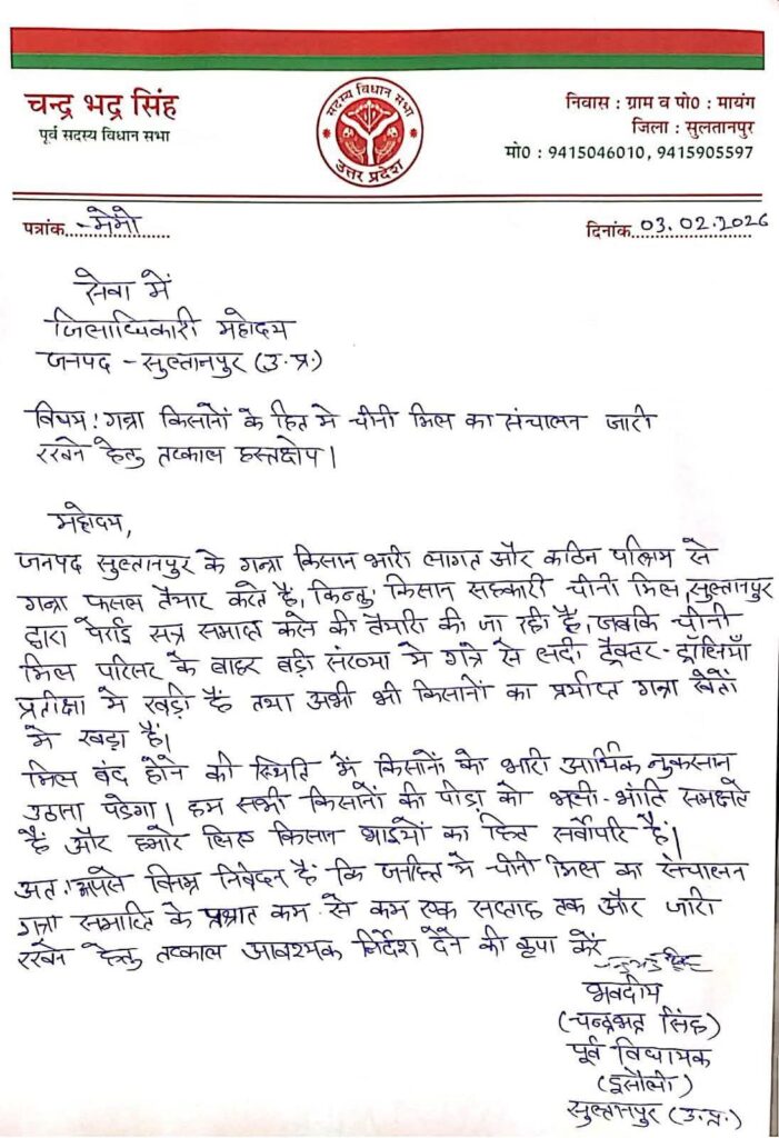 चीनी मिल का संचालन जारी रखने के लिए इसौली पूर्व विधायक व सपा नेता चंद्रभद्र सिंह सोनू ने लिखा DM को पत्र