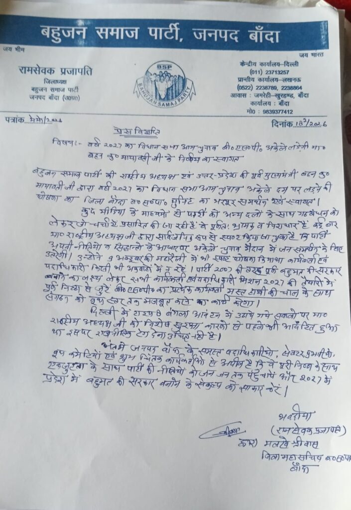 बहुजन समाज पार्टी (बसपा) के जिलाध्यक्ष रामसेवक प्रजापति ने प्रेस विज्ञप्ति जारी कर कहा है कि वर्ष 2027 का उत्तर प्रदेश विधानसभा चुनाव पार्टी अपने दम पर लड़ेगी और पूर्ण बहुमत की सरकार बनाएगी। उन्होंने स्पष्ट किया कि पार्टी सुप्रीमो मायावती ने किसी भी दल के साथ गठबंधन की संभावनाओं को सिरे से खारिज कर दिया है और संगठन को जमीनी स्तर पर मजबूत करने के निर्देश दिए हैं।