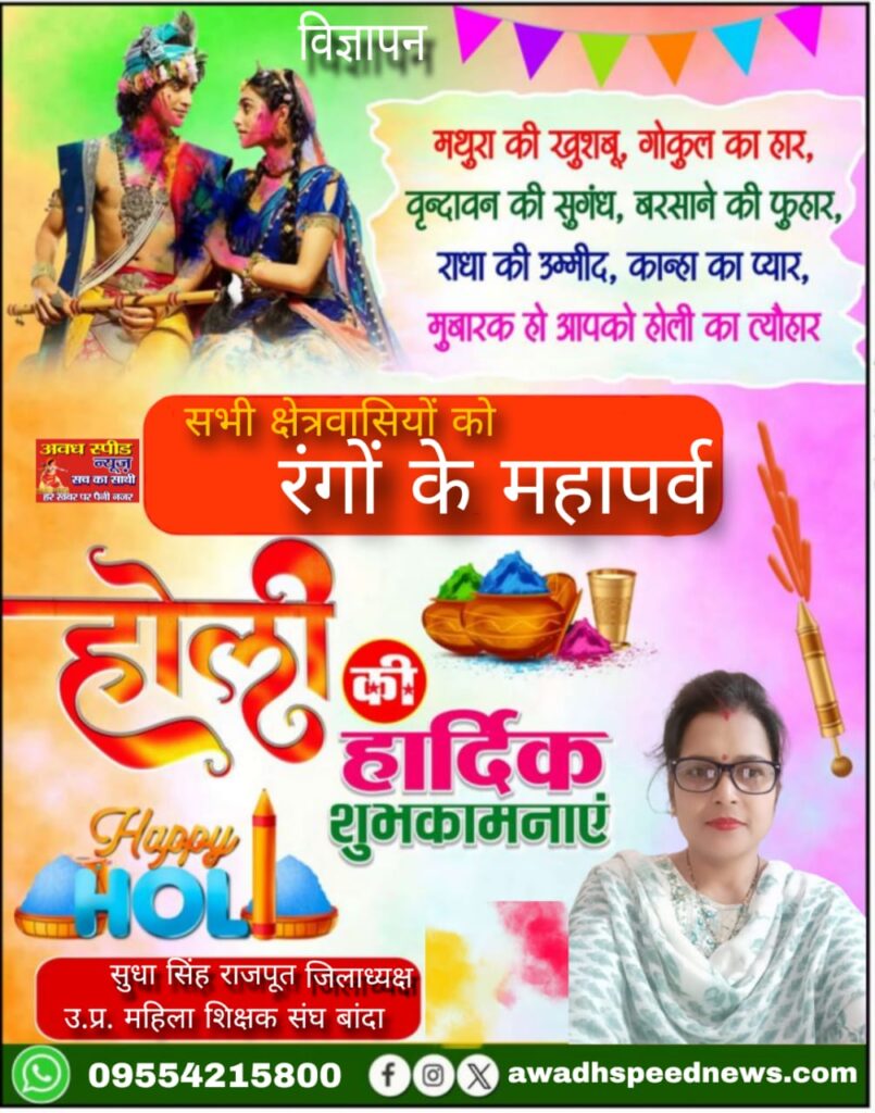 सुधा सिंह राजपूत, जिलाध्यक्ष, उत्तर प्रदेश महिला शिक्षक संघ, बांदा की ओर से सभी देशवासियों एवं क्षेत्रवासियों को रंगों के महापर्व होली की हार्दिक बधाई एवं शुभकामनाएं प्रेषित की गई हैं। उन्होंने अपने संदेश में कहा कि होली आपसी प्रेम, सौहार्द और भाईचारे का प्रतीक है। यह पर्व समाज में एकता और सद्भाव का संदेश देता है। उन्होंने सभी से अपील की कि होली को शांति, सद्भाव और सुरक्षित वातावरण में मनाएं तथा समाज में सकारात्मक ऊर्जा का संचार करें।