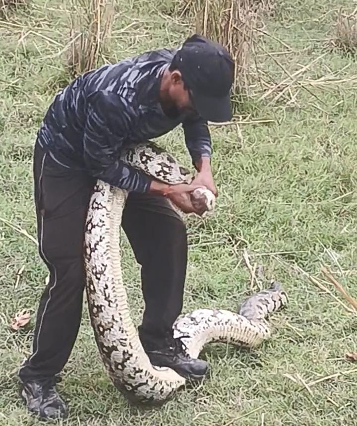 सर्प मित्र राजू मिश्रा ने रेस्क्यू किया विशालकाय अजगर वन विभाग को सौंपा