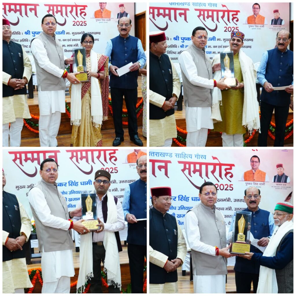 मुख्यमंत्री पुष्कर सिंह धामी ने मुख्य सेवक सदन, मुख्यमंत्री आवास में उत्तराखंड भाषा संस्थान द्वारा आयोजित उत्तराखंड साहित्य गौरव सम्मान समारोह-2025 में उत्तराखंड के सर्वोच्च साहित्यिक सम्मान “उत्तराखंड साहित्य भूषण सम्मान” से डॉ. जितेन ठाकुर को सम्मानित किया। इसके साथ मुख्यमंत्री ने डॉ. बुद्धिनाथ मिश्र, श्याम सिंह कुटौला, डॉ. प्रीतम सिंह, केसर सिंह राय एवं अताए साबिर अफजल मंगलौरी को “उत्तराखंड दीर्घकालीन उत्कृष्ट साहित्य सृजन पुरस्कार” से सम्मानित किया । मुख्यमंत्री पुष्कर सिंह धामी द्वारा विभिन्न विधाओं में उत्कृष्ट साहित्यकारों एवं “युवा कलमकार प्रतियोगिता” के विजेताओं को भी सम्मानित किया गया। मुख्यमंत्री ने साहित्य नारी वंदन सम्मान के अंतर्गत प्रो. दिवा भट्ट, उत्कृष्ट बाल साहित्य हेतु प्रो. दिनेश चमोला, उत्तराखंड मौलिक रचना पुरस्कार के अंतर्गत डॉ भूपेंद्र बिष्ट, डॉ सुधा जुगरान, श्री शीशपाल गुसाई, उत्कृष्ट कुमाऊनी एवं गढ़वाली साहित्य हेतु तारा पाठक, श्री हेमंत सिंह बिष्ट एवं गजेंद्र नौटियाल आदि को सम्मानित किया |मुख्यमंत्री पुष्कर सिंह धामी ने अपने संबोधन में कहा कि उनके लिए यह अत्यंत गर्व का विषय है कि उन्हें प्रदेश के महान साहित्यकारों को सम्मानित करने का अवसर प्राप्त हुआ। उन्होंने बताया कि “उत्तराखंड साहित्य भूषण सम्मान” से सम्मानित डॉ. जितेन ठाकुर न केवल उत्तराखंड बल्कि पूरे हिंदी साहित्य जगत के लिए प्रेरणा स्रोत हैं। मुख्यमंत्री ने बताया कि उत्तराखंड को साहित्यिक पर्यटन के केंद्र के रूप में विकसित करने के लिए राज्य में दो “साहित्य ग्राम” स्थापित किए जा रहे हैं, जहां साहित्यकारों को आधुनिक सुविधाएं उपलब्ध कराई जाएंगी। इस दौरान कैबिनेट मंत्री सुबोध उनियाल, खजान दास, विधायक सविता कपूर सहित बड़ी संख्या में विद्वान, लेखक, साहित्यकार, पत्रकार एवं साहित्य प्रेमी उपस्थित रहे।