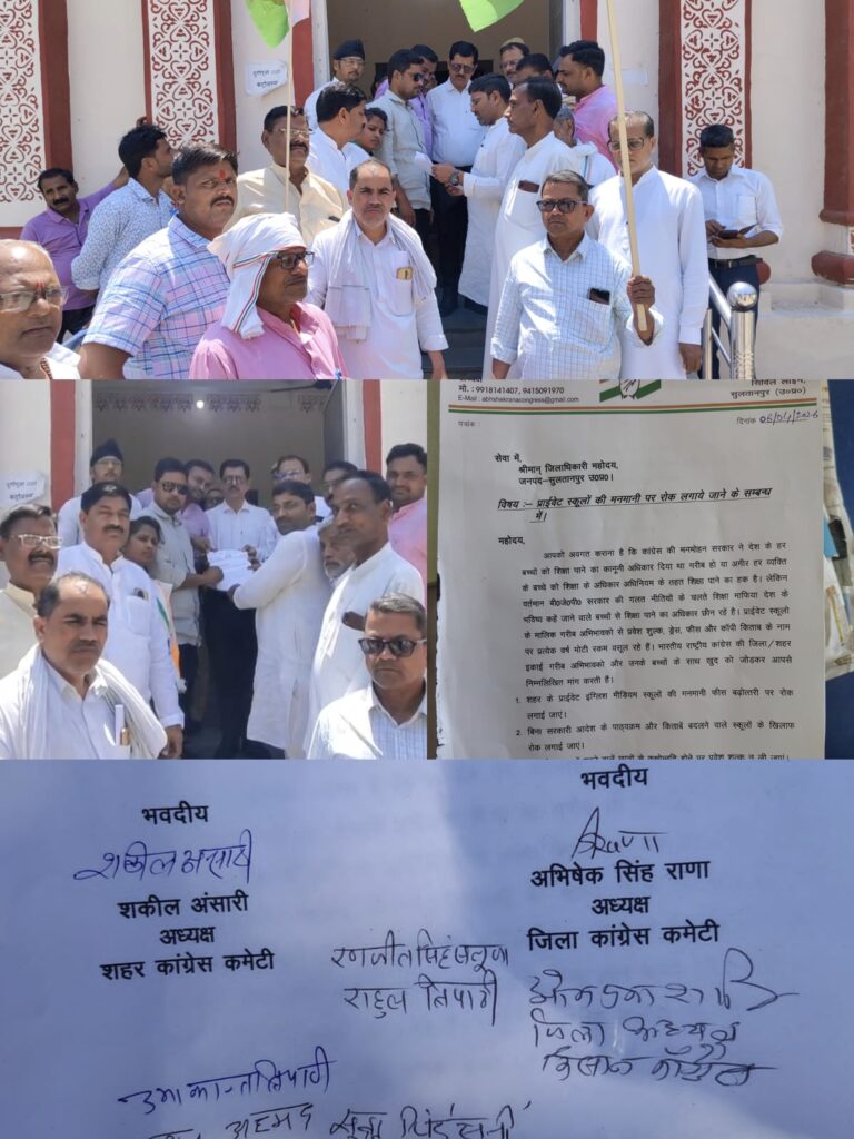 शहर अध्यक्ष शकील अंसारी ने कहा कि निजी स्कूलों की मनमानी अब बर्दाश्त के बाहर हो चुकी है। हर साल अभिभावकों से मोटी रकम वसूली जा रही है। यह गरीबों के हक पर सीधा डाका है, जिसे कांग्रेस किसी भी कीमत पर सहन नहीं करेगी। उन्होंने प्रशासन से मांग की है कि निजी स्कूलों की मनमानी फीस वृद्धि पर रोक लगाई जाए, बिना अनुमति पाठ्यक्रम व किताबें बदलने वाले स्कूलों पर कार्रवाई हो, बार-बार ड्रेस बदलने की प्रथा खत्म की जाए और कमजोर वर्ग के बच्चों को निःशुल्क शिक्षा दी जाए। साथ ही निजी स्कूलों की सालाना आय की जांच कराने की भी मांग की गई है।कांग्रेस ने साफ कर दिया है कि यदि जल्द कार्रवाई नहीं हुई तो आगामी बृहस्पतिवार को जिले में धरना-प्रदर्शन किया जाएगा, जिससे हालात गरमा सकते हैं। इस मौके पर राहुल त्रिपाठी, ओम प्रकाश सिंह,हरीश त्रिपाठी, सलाहुद्दीन हाशमी, सुरेन्द्र शुक्ल, रणजीत सिंह सलूजा, निकलेस सरोज,शरद श्रीवास्तव, शुव्रत सिंह,अपरबल सिंह, जाकिर हसन,मो मंसूर, अतीक अहमद,उमाकांत त्रिपाठी, इमरान अहमद,प्रभा शंकर मिश्र,सुरेश चंद्र मिश्र, विकास मिश्र,शीतला प्रसाद साहू समेत दर्जनों लोग मौजूद रहे।