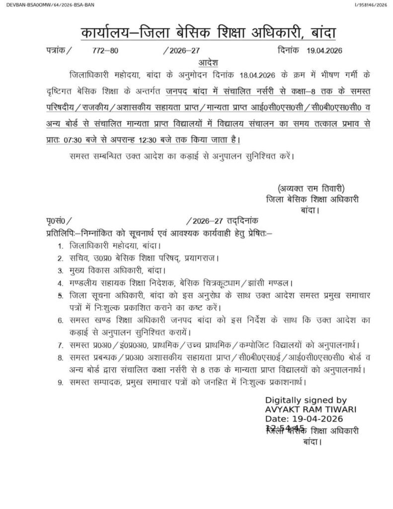 भीषण गर्मी के चलते बांदा में स्कूलों का समय बदला, सुबह 7:30 से दोपहर 12:30 तक होंगे संचालित