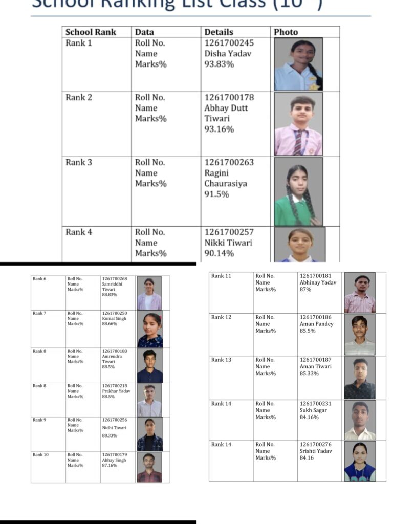प्रबंधक उमा शंकर शुक्ल, उप प्रबंधक रमा शंकर शुक्ल, प्रभा शंकर शुक्ल, प्रधानाचार्या शिखा दूबे, राम सूरत तिवारी आदि ने खुशी व्यक्त की। दिशा यादव 93.83% , अभय दत्त तिवारी 93.16%, रागिनी चौरसिया 91.5%, निक्की तिवारी 90.14%, श्रेया तिवारी 89.83%, समृद्धि तिवारी 88.83%, कोमल सिंह 88.66%, अमरेंद्र तिवारी 88.5%, प्रखर यादव 88.5%, निधि तिवारी 88.33%, अभय सिंह 87.16%, अभिनय यादव 87%, अमन पाण्डेय 85.5%, अमन तिवारी 85.33%, सुख सागर 84.16%, सृष्टि यादव 84.16%, प्रतिशत अंक प्राप्त कर अपनी प्रतिभा का लोहा मनवाया।